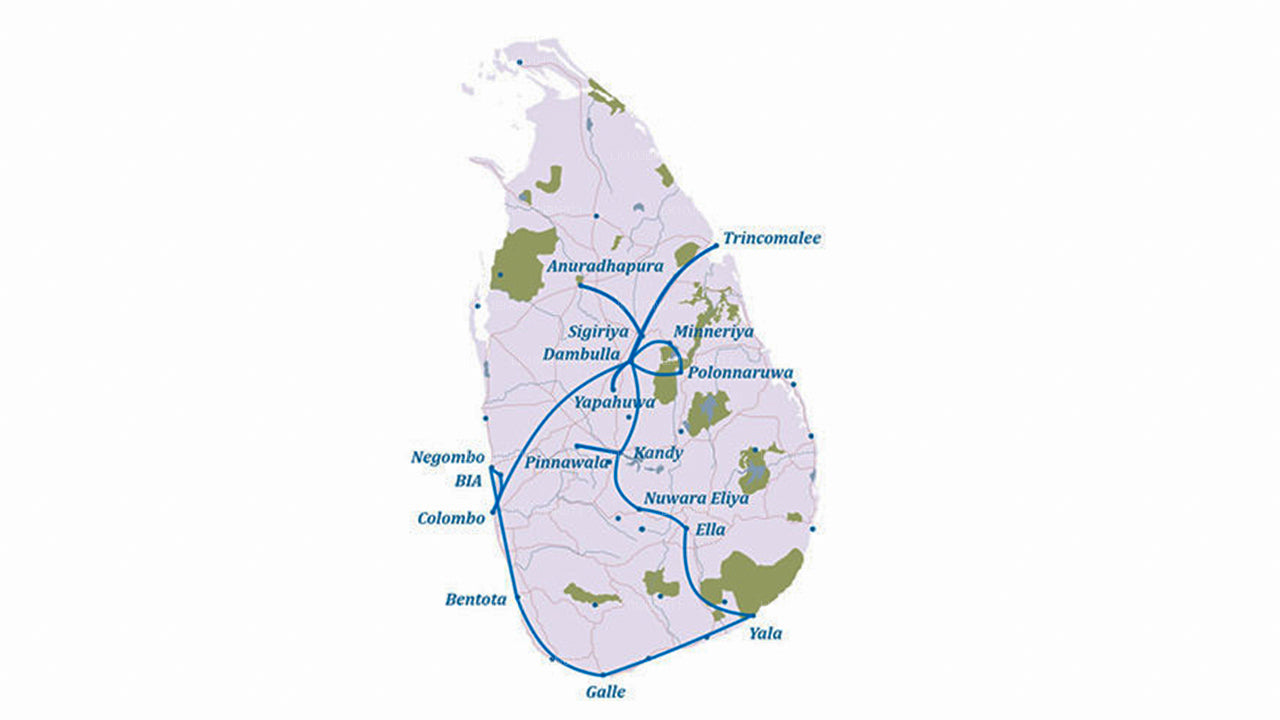 Efter en dag i Negombo tager vi sydpå og overnatter i Galle, hvor vi udforsker omgivelserne. Turen starter i mindeværdige omgivelser, lige fra et besøg på et skildpaddeopdræt og Galle Fort til en safari i Madu-flodens rolige vand. På vej til Yala ser vi styltefiskere i Koggala og nyder derefter en spændende safari i nationalparken, den næststørste på øen. Rejs til Ella, udforsk det bjergrige terræn og nyd en naturskøn togtur til Nuwara Eliya. Nyd gåture i byen og Horton Plains Nationalpark. Tilbring tid i de gamle byer Kandy og Dambulla, og tag til Trincomalee på østkysten.