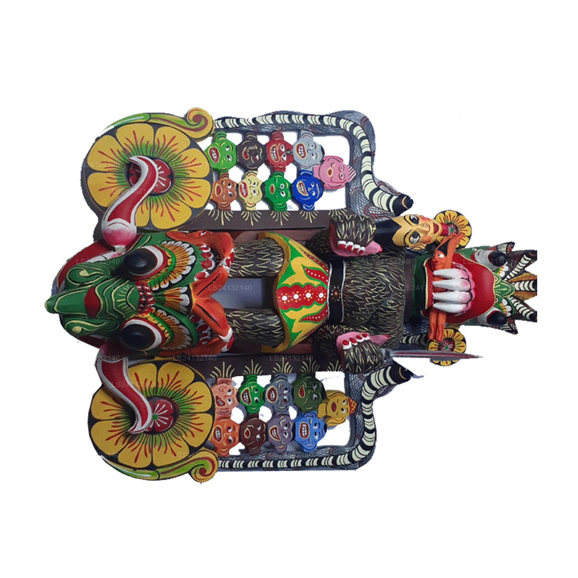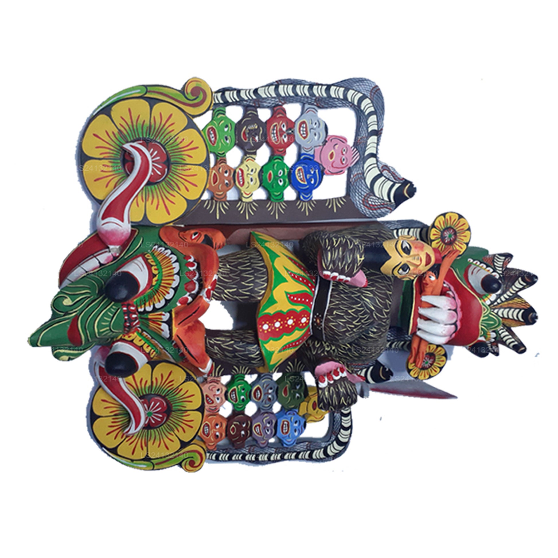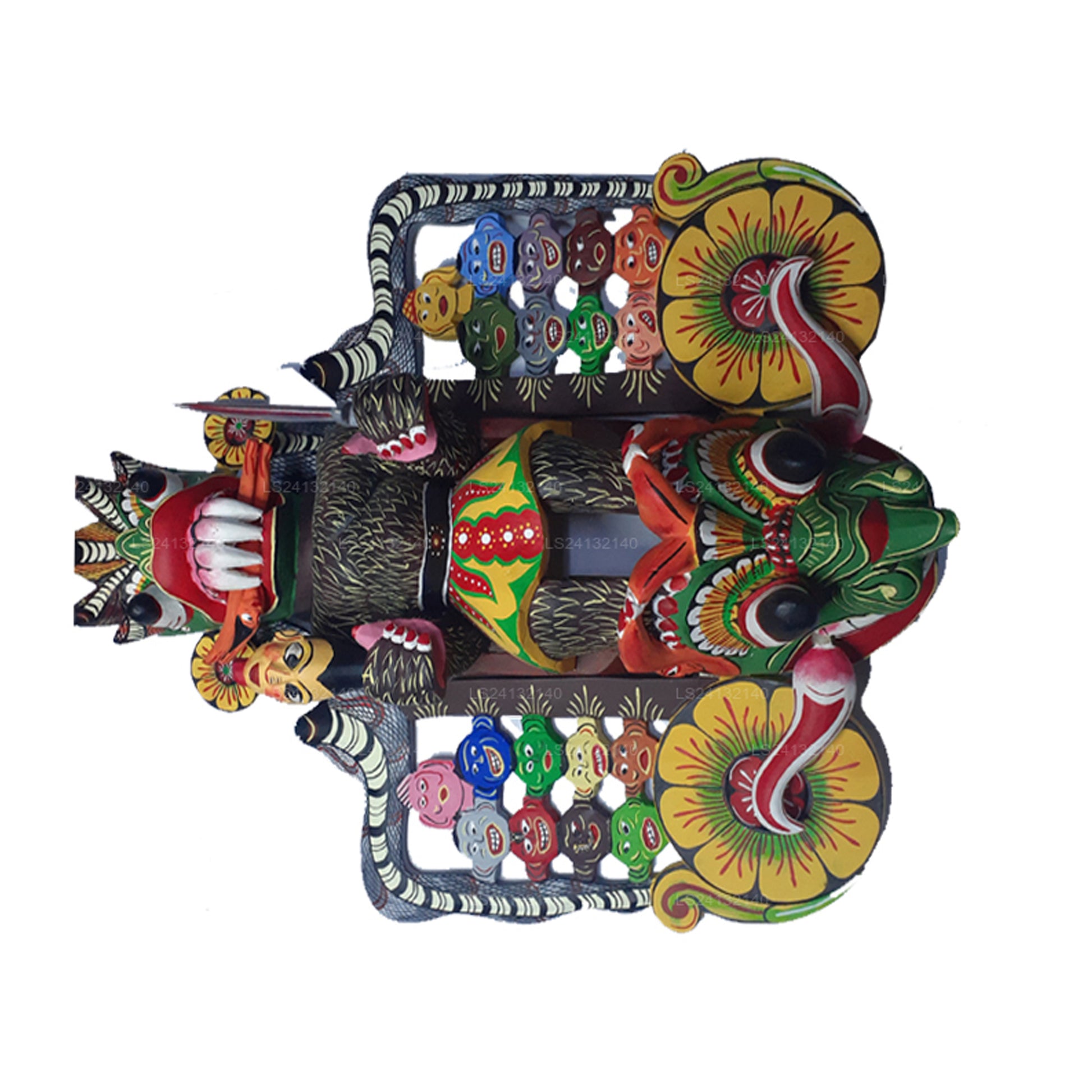 The 18 masks in this collection are part of the traditional Sanni Yakuma ritual, each representing a different aspect of the demon Maha Kola Sanni. The central, larger mask features all 18 smaller masks within it, symbolizing the complete presence and power of the demon in the ceremony. This showcase highlights the intricate craftsmanship and cultural significance of Sri Lanka’s ritualistic mask traditions.