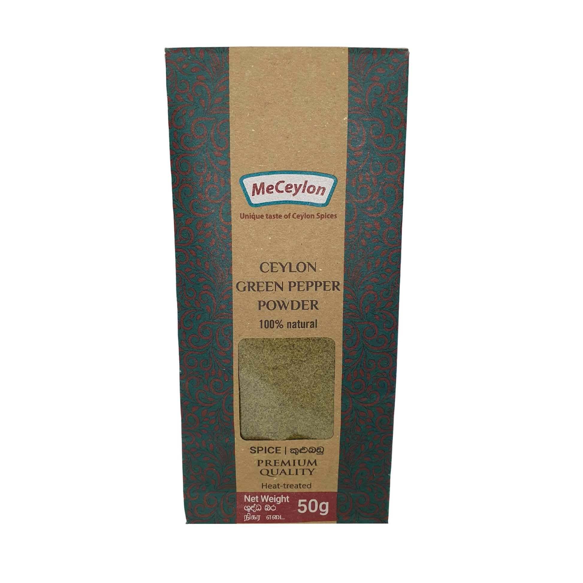 Me Ceylon Ceylon Green Pepper Powder er et førsteklasses srilankansk krydderi, der omhyggeligt produceres ved at høste Piper nigrum bær inden fuld modenhed og soltørring eller dehydrering af dem for at låse deres friske, saftige smag ind. Mildere og subtilt frugtagtig sammenlignet med sort peber tilbyder dette pulver med en enkelt ingrediens duftende aroma og lys varme. Ideel til at krydre fisk og skaldyr, saucer og lette retter, der drager fordel af et blidt peberkick. Den er fremstillet uden tilsætningsstoffer eller konserveringsmidler og leverer autentisk Ceylon-krydderikarakter med klarhed og ren