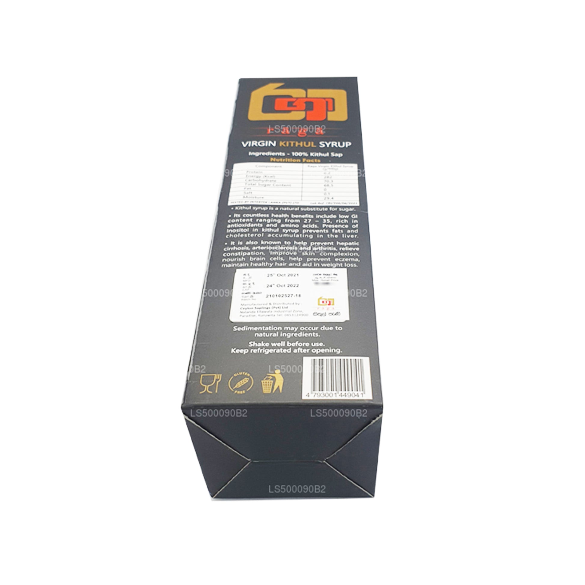 Detsmager ikke kun godt, det får dig også til at føle dig godt, det hjælper med at lindre forstoppelse og forhindrer åreforkalkning (fortykkelse og afstivning af arterierne), Gigt, skrumpelever, Kolesterol og nærer hjernecellerne, bare for at nævne nogle få af fordelene ved brugen af Kithul sirup. Teamet hos RAGA kan prale af, at deres produkt er „unapologetisk ægte“, og er både gennemsigtige og ærlige om at levere et produkt, der er tro mod naturen og den arv, som Kithul stammer fra.“ Denne Kithul sirup er produceret, overholder ISO 22000 retningslinjer.