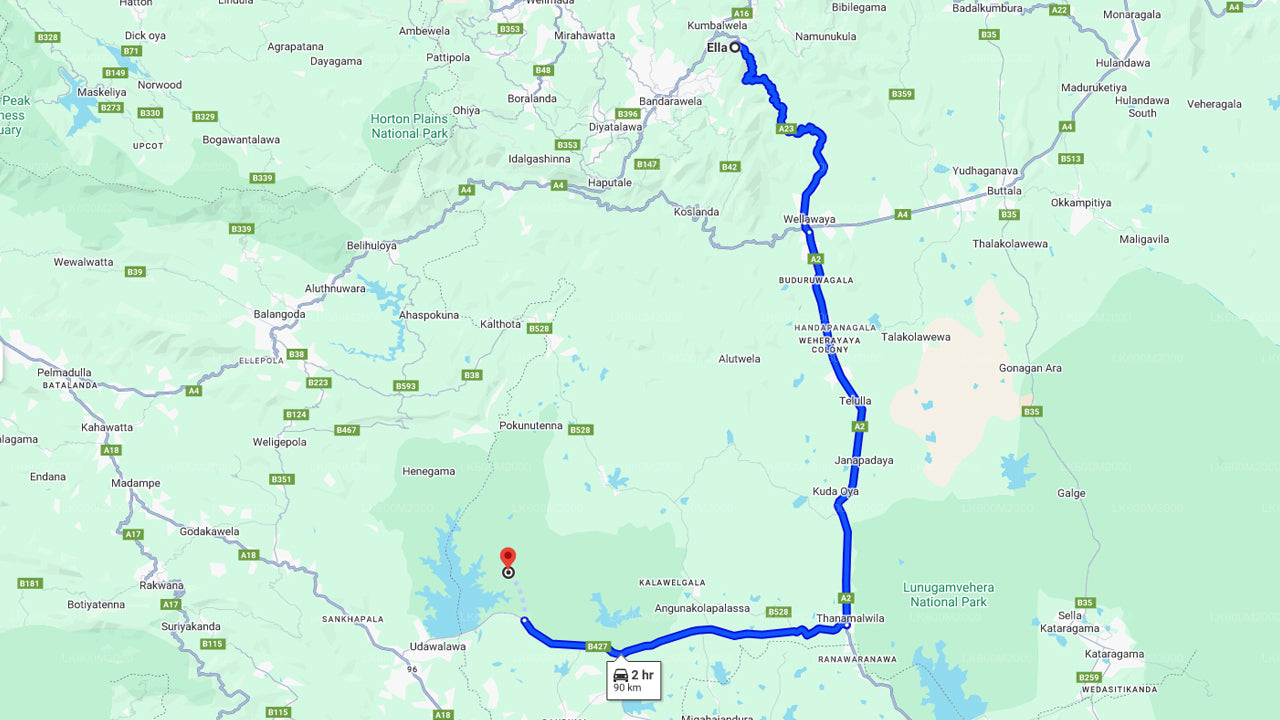 Du starter din tur fra dit hotel i Ella kl. 12.00. Din chauffør vil afhente dig fra hotellet og køre dig til Udawalawe. Du vil nå Udawalawe kl. 13.30.