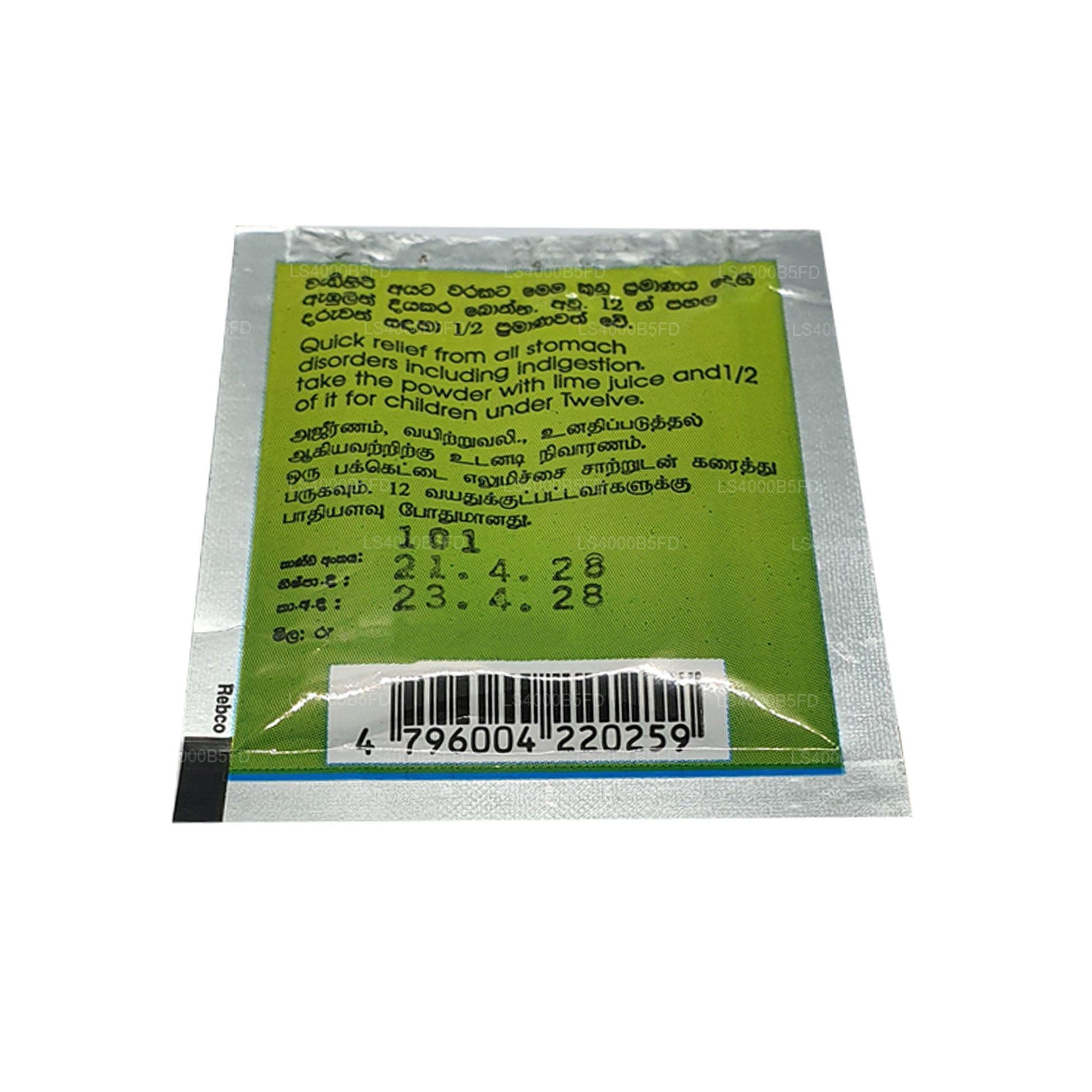 Wickramarachchi Labs Ajeerna Suwaya (5g) is a natural Ayurvedic remedy designed to provide quick relief from stomach disorders, including indigestion. This potent powder is made from carefully selected herbs known for their digestive benefits. To use, simply mix the powder with lime juice for fast relief. It can be safely used by children under twelve by taking half of the recommended dose. A trusted solution for maintaining digestive health and alleviating discomfort, Ajeerna Suwaya offers a simple and effective way to soothe your stomach.